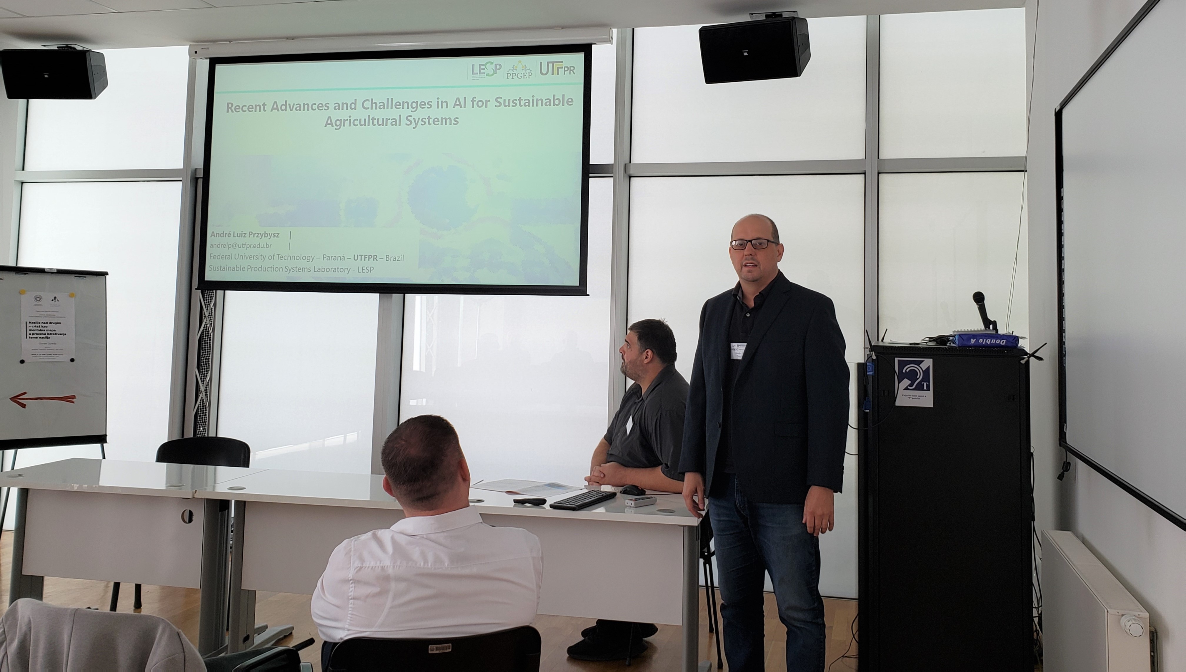 O professor André Luiz Przybysz, integrante do LESP, participou da conferência apresentando o artigo “Recent Advances and Challenges in AI for Sustainable Agricultural Systems”, contribuindo para o debate internacional sobre os desafios e inovações no uso da inteligência artificial em sistemas agrícolas sustentáveis.